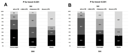 The distribution of VAI-defined adipose tissue dysfunction (ATD) types in respective BMI-defined (A) and BAI-defined (B) weight categories.