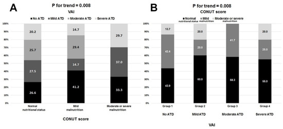 The distribution of VAI-defined adipose tissue dysfunction (ATD) types in respective CONUT score-defined nutritional status (A) and the distribution of nutritional status in respective VAI-defined types of adipose tissue dysfunction (ATD) (B).