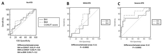 Figure 3 depicts the high variability in the distribution of BMI-defined (Figure 3A) and BAI-defined (Figure 3B) weight categories across all four types of ATD. In particular, these discrepancies were seen in roughly 30–60% of participants with respect to BMI and 50–80% of participants with respect to BAI. Likewise, each of the BMI-defined and BAI-defined weight categories included patients with all forms of ATD (Figure 4A,B respectively). A total of 75% of patients with normal nutritional status had some form of ATD, and one-third of patients with moderate or severe malnutrition did not have any ATD (Figure 5A). By contrast, 55–60% of patients with mild, moderate, or severe ATD had normal nutritional status (Figure 5B). ROC analysis showed BMI, BAI, and CONUT scores to have a weak predictive value in determining no ATD (Table 5). Only BMI had a weak predictive value in determining mild ATD. Both the BMI and BAI had a strong predictive value for determining severe ATD, but the CONUT score did not have any discriminating power for mild, moderate, or severe ATD (Table 5). BAI, BMI, and CONUT score had similar predictive values for determining no ATD; however, BMI better predicted mild ATD and severe ATD than did BAI (difference between AUC 0.12 p = 0.0002) (Figure 6). BMI was associated with ATD in unadjusted and adjusted models, whereas nutritional status was not (Table 6). The risk of ATD increased by 9% per 1 kg/m2 increment in BMI in the unadjusted model (OR 1.09) and by 8–15% per 1 kg/m2 increment in BMI in four adjusted models (ORs 1.08, 1.11, 1.10, 1.15, respectively).