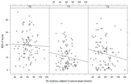 Pearson correlations between 25-hydroxy vitamin D serum levels and depressive symptoms (T0 = admission, T1 = discharge, T2 = 1 year follow up). BDI = Beck Depression Inventory, 25(OH)D = 25-hydroxy vitamin D serum level.