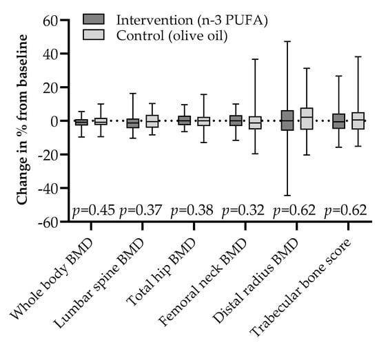 Changes in bone mineral density and trabecular bone score by intention to treat after 44 weeks of 2.6 g daily supplementation with marine n-3 polyunsaturated fatty acids or olive oil in adult kidney transplant recipients; median (line) with interquartile range (box) and full range (whiskers).