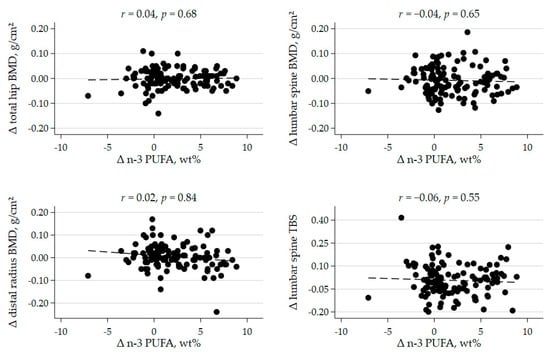 Scatterplots of the correlation between change in plasma marine n-3 polyunsaturated fatty acid (n-3 PUFA) concentration and change in bone mineral density (BMD) and trabecular bone score (TBS) after 44 weeks, r = Pearson’s correlation coefficient, with corresponding p value.