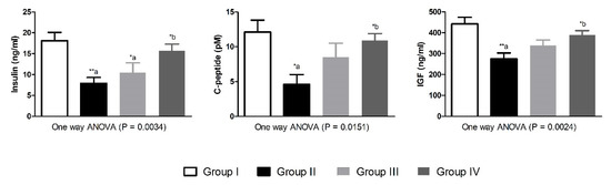 Effects of morin on insulin/IGF-1 levels in normal and diabetic Wistar rats. Data were expressed as Mean ± S.E. (n = 6). Statistical analysis was conducted by one-way ANOVA followed by Tukey post hoc test. The significances were considered as follow (*) p < 0.05 and (**) p < 0.01. Group-I was compared to diabetic groups (a), while Group-II was compared to Group-III and Group-IV (b).
