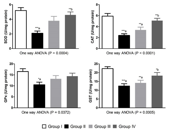Effects of morin on antioxidant enzymes activities in normal and diabetic Wistar rats. Data were expressed as Mean ± S.E. (n = 6). Statistical analysis was conducted by one-way ANOVA followed by Tukey post hoc test. The significances were considered as follow (*) p < 0.05, (**) p < 0.01 and (***) p < 0.001. Group-I was compared to diabetic groups (a), while Group-II was compared to Group-III and Group-IV (b).