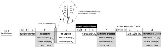 Twelve competitive male cyclists participated in this study, which was approved by the human research ethics committees of the Australian Institute of Sport (20140612) and the Australian Catholic University (2014 254N). These subjects (32.6 ± 5.1 years; 79.2 ± 9.5 kg; 5.1 ± 0.6 L/min maximum oxygen consumption, and 639 ± 115 W maximum power output) represented a sub-group of a larger cohort who undertook the main project under which this study was performed [28]. This study employed a parallel group design to investigate the effect of creatine loading, followed by a within-group cross-over application of carbohydrate loading on muscle substrate, water content, and performance (Figure 1). The participants came in for four separate biopsy and ultrasound measurements; baseline (day 0, 6 g carbohydrate/kg body mass (BM)/day for 48 h), glycogen depleted (day 1) and either glycogen loaded or glycogen normal (6 g carbohydrate /kg BM/d for 48 h) with or without creatine supplementation (days 7 and 14). Manipulations of creatine and glycogen stores were achieved by implementing “best practice protocols” of creatine loading (20 g/day for 5 days loading and 3 g/day for maintenance) [30] and glycogen loading (12 g CHO/kg BM/day for 48 h) [31] through a standardised pre-packaged diet. Furthermore, a supervised cycling protocol of ~3.5 h was undertaken to deplete muscle glycogen stores. The cycling protocol involved a 120 km time trial, with alternating 1 km and 4 km sprints every 10 km, followed by a ride to exhaustion at 8% gradient and 88% VO2max; further details can be found in [28]. Participants consumed 60 g/h CHO during the cycling protocol with post-exercise intake of a low CHO diet (<1 g CHO/kg BM) to restrict the repletion of glycogen stores before a further assessment of muscle glycogen content the following morning. This protocol was chosen to allow us to align our assessment of the depleted glycogen condition with DXA-estimates of body composition assessed according to best practice protocols (overnight fasted and rested conditions [32]). This study design provided situations where muscle glycogen was measured under baseline and normalised conditions, a depleted condition, and CHO loaded with or without creatine loading. Four biopsies were conducted over the course of the study, with each being collected from the same leg from an incision that was as least 2 cm from the previously biopsied site [19] [Figure 1: Bx1–Bx4]. The protocol used for these biopsies, and the determination of glycogen and creatine content in the muscle samples, is described in full elsewhere [28].