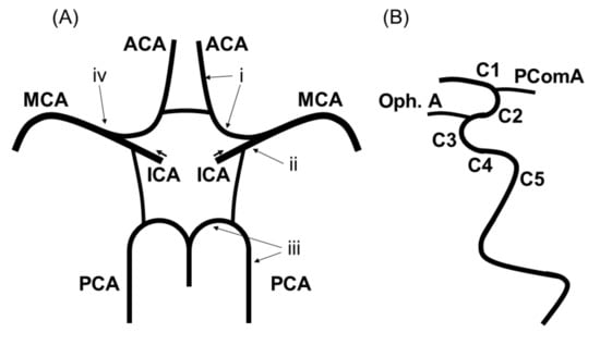 - Fischer, E. Die Lageabweichungen de vorderen hirnarterie im gefaessbild. Zentralbl. Neurochir. 1938, 3, 300–313. [Google Scholar]