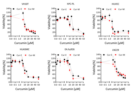 First, we studied the effect of Cur-E and Cur-M on the cell’s viability, which was comparatively analysed on different cell systems, including human telomerase-immortalized fibroblasts VH10T, cancer cells (the glioblastoma line LN229), human endothelial cells (the line EA.hy926), human primary vascular endothelial cells (HUVEC), human primary smooth muscle cells (HUASM) and human primary pericytes (hPC-PL). As shown in Figure 1, in all cell systems, Cur-E and Cur-M were equally cytotoxic, reducing the viability in a concentration range between 5 and 50 µM. Below 5 µM, neither Cur-E nor Cur-M exerted a significant reduction in viability in all cell types, except HUVEC (for D50 doses see Supplementary Materials, Figure S2). Freshly isolated human monocytes, macrophages and T cells responded with curcumin concentrations >15 µM (Supplementary Materials, Figure S3).