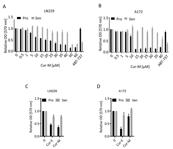 Many genotoxic agents induce not only apoptosis, but also cellular senescence (CSEN). A potential for curcumin to induce CSEN was shown previously (for a review, see [36]). Here, we pursued to determine the senolytic potential of curcumin, i.e., the selective ability of a compound to kill senescent cells. The methylating anticancer drug temozolomide is a potent inducer of CSEN in p53 functionally active glioblastoma cells [37]. We induced CSEN in LN229 and A172 cells as previously described [38] and assessed whether curcumin is able to kill preferentially senescent cells. For comparison, we used the well-known senolytic drug ABT-737 [39]. We compared the effect of Cur-M on proliferating versus senescent cells. The data revealed that Cur-M was clearly more effective in reducing the viability of proliferating than senescent LN229 (Figure 3A) and A172 (Figure 3B) cells. This is in sharp contrast to ABT-737, which showed a clear senolytic effect on glioblastoma cells, being more effective on senescent cells (Figure 3A,B). The data were substantiated comparing Cur-E and Cur-M, which were equally effective in reducing the viability of proliferating versus senescent cells (Figure 3C,D).
