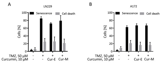 To substantiate the data further, we measured the relative amount of senescent and apoptotic cells in the population eight days after temozolomide treatment and, following addition of Cur-E or Cur-M to the medium, two days later. The data revealed that curcumin (10 µM) had no impact on the yield of temozolomide-induced senescent cells and the total cell death (early and late apoptosis/necrosis) level in the population (Figure 4A,B). Overall, the data show that curcumin in a subtoxic concentration has no senolytic activity and does not impact the senescence level, irrespective of whether it is administered as Cur-E or Cur-M.