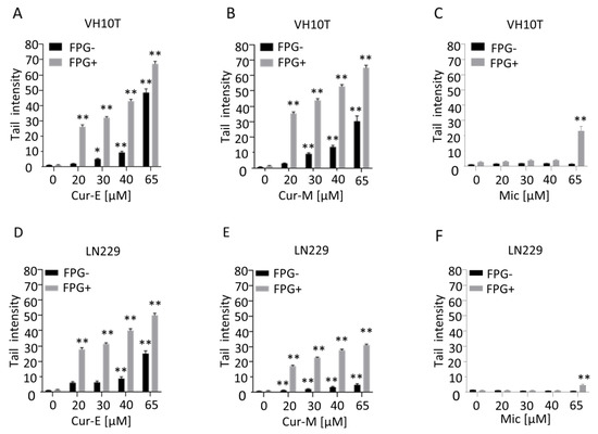 Curcumin induces DNA damage in a dose-dependent manner. Proliferating VH10T (A–C) and LN229 (D–F) cells were treated with the respective concentrations of curcumin. (A,D), curcumin was solubilised in ethanol (Cur-E) or (B,E), administered as micelles (Cur-M). As control, cells were also treated with water-micelles (Mic, C,F). Alkaline comet assay with and without FPG was performed 24 h post-treatment. Asterisks indicate significant difference to control * p < 0.05; ** p < 0.01.