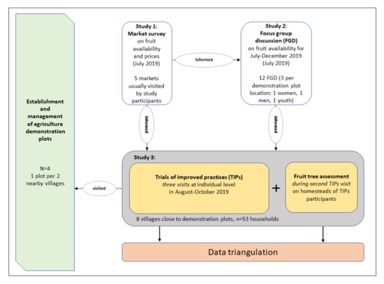 In this study, we applied a multiphase mixed method study design. This combined focus group discussions and a market survey along with agriculture activities on a demonstration plot, with a formative research approach over different project phases [26]. The demonstration plots were established close by the homesteads of the study participants. The data collected in the market survey and focus group discussions were used to design the formative research and quantitative data collection (Figure 1). The data from the formative research (Trials of Improved Practices (TIPs)) and the quantitative data collection were finally triangulated.