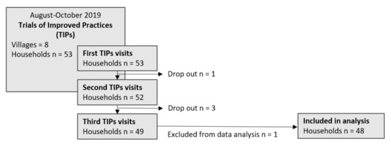 The women’s ages ranged from 22 to 58 years with an average of 36 ± 10 years. They took care of one to four children below the age of 9 years. At the beginning of the trials, 53 households were included into the study. Five households dropped out during the TIPs phase. Two households moved away, and two households withdrew their approval to participate in the study due to lack of interest. One household had to be excluded from the data analysis as a result of changes in the family situation and the need for extra counselling by the facilitator, which led to biased data. Hence, 48 households were included in the final data analysis (Figure 3).