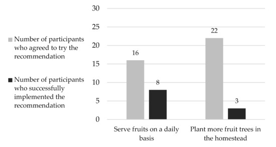 Overall, most of the key recommendations for child feeding practices were successfully implemented with high implementation rates of above 90%. Out of the 13 recommendations, the two recommendations (1) to serve fruits on a daily basis and (2) plant (a) fruit tree (s), had the lowest implementation rates, indicating that these recommendations were the most challenging for the families. In the case of the recommendation to serve fruits on a daily basis, only 50% of the 16 families who tested this recommendation managed to do so and only 14% of the 22 families who agreed to plant a fruit tree managed to do so successfully (Figure 4).