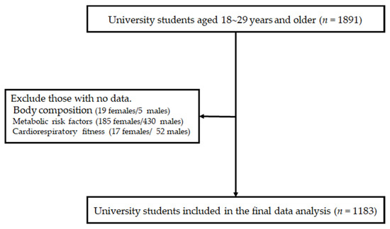 We initially invited 1891 university students (30% female) who registered for the lecture “exercise and health” during the 2017 to 2018 and 2018 to 2019 academic years at Sungkyunwan University, Suwon, Republic of Korea. All participants aged 18–29 years were apparently healthy, had no diagnosed chronic diseases (i.e., diabetes, hypertension, dyslipidemia, thyroid disease, or others), and did not take medications affecting BP, glucose, or lipid levels or related to weight control. Among the initial participants, those who refused or missed measurements of body composition (19 females and 5 males), metabolic risk factors (185 females and 430 males), and CRF (17 females and 52 males) were excluded. Consequently, a total of 1183 university students (29.6% female) were included in the final data analyses (Figure 1). Sample size was determined based on the outcomes of our pilot study. Using an expected correlation coefficient of 0.11, we calculated that a sample size of 775 would be required at an α level of 0.05 and β level of 0.80, with the assumption of approximately 20% dropout rate (G*Power v3.1). The appropriate institutional review board reviewed and approved the study (approval no. SKKU 2017-06-011-001) in accordance with the Declaration of Helsinki. All participants provided written informed consent.