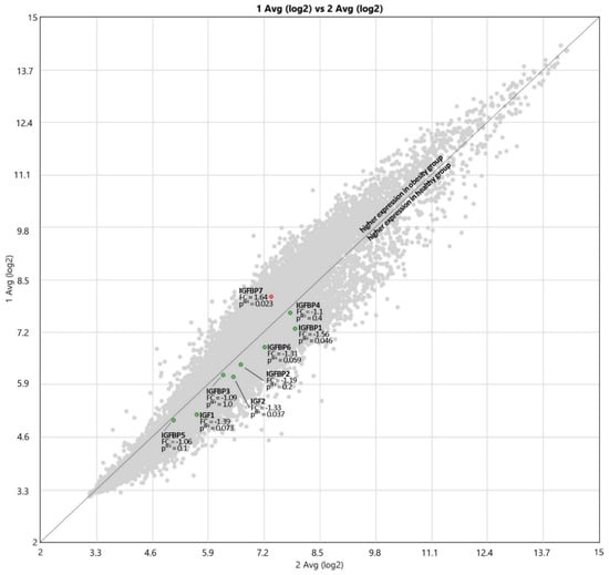 | IGFBP1 | 7.28 | 7.91 | −1.56 | 0.046 |