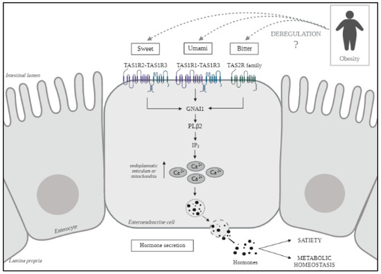 Nutrient taste receptors signaling in enteroendrocrine cells. The detection of sugars molecules is mediated by TAS1R2–TAS1R3, umami sensing is achieved by TAS1R1–TAS1R3 and bitter detection is mediated by the TAS2R family. When nutrients bind their receptors, the signaling pathway is activated, causing an increase of intracellular calcium that ultimately induces the release of hormones involved in the process of satiety and metabolic homeostasis [24]. Obesity seems to deregulate this pathway but the precise mechanism is still unknown [25]. TAS1, taste 1 receptor family; TAS2, taste 2 receptor family; GNAI1, guanine nucleotide-binding protein G; PLβ2, phosphatidylinositol phospholipase C; IP3, inositol trisphosphate; Ca2+, calcium 2+.
