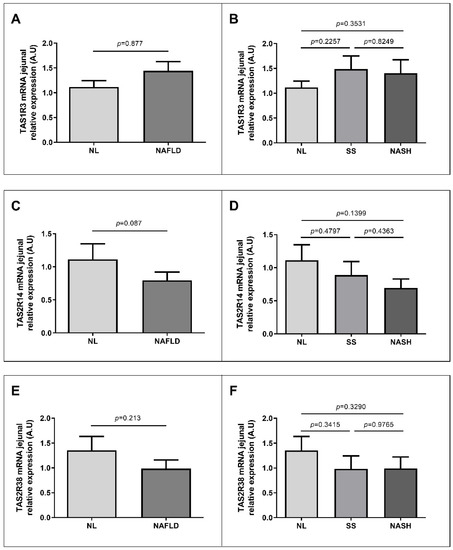 To examine the possible role of TAS in NAFLD, we wanted to evaluate the JRE of TAS1R2, TAS1R3, TAS2R14 and TAS2R38 in a cohort with MO classified into NL and NAFLD groups. As stated above, we did not observe expression of TAS1R2 in jejunum samples. Besides, we did not report differences in JRE of TAS1R3 (Figure 3A), TAS2R14 (Figure 3C) or TAS2R38 (Figure 3E) between NL group and NAFLD subjects.