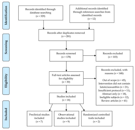 Experimental animal studies included in this review met the following criteria: (1) evaluating the effects of treatment with carotenoids (including lutein, L and/or zeaxanthin, Z) on outcomes of retinal neurodegeneration, such as markers of oxidative stress, cell viability and visual performance in murine models of DR; (2) carotenoid interventions include powder diet supplemented with L and/or Z only, nutraceutical diet containing L/Z, and powder diet supplemented with micronutrient formula containing L/Z; (3) presentation of DR pathology induced using standard induction methods (i.e., administration of the drug alloxan/streptozotocin, high-sugar diet, and surgical or chemically-induced damage) or genetic models (namely the Leprdb model) in rodents only; and (4) experimental models of type 1 or type 2 diabetes in rodents were included.