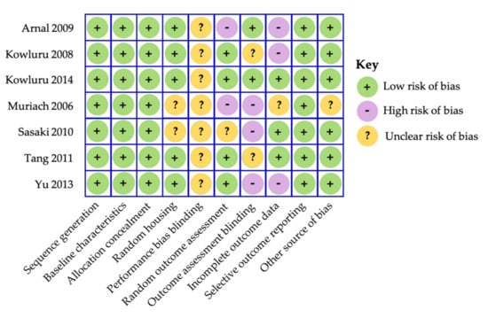 There is limited evidence of RCTs evaluating the benefits of carotenoids in management of diabetic retinopathy. We used the Cochrane Collaboration’s tool for assessing risk of bias, which covers the following domains—selection bias, performance bias, detection bias, attrition bias, reporting bias, and other bias []. Figure 4 provides a summary of the risk assessed using the Cochrane Collaboration’s tool.
