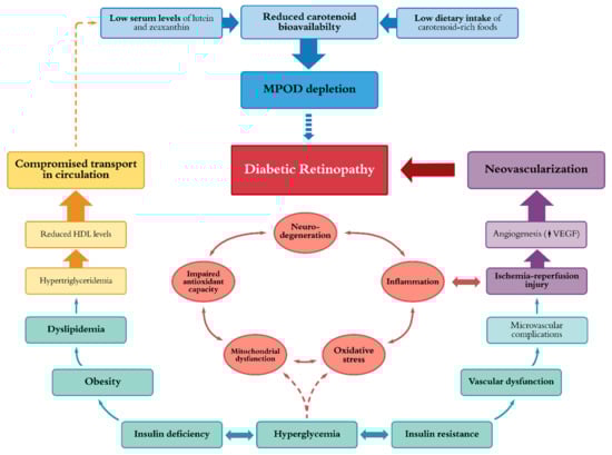 Schematic overview of proposed causative mechanisms and metabolic perturbations implicated in diabetic retinopathy. MPOD, macular pigment optical density; HDL, high-density lipoprotein; VEGF, vascular endothelial growth factor.