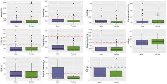 From the analysis of dietary intakes of different genders, we found that, with the exception of the intakes of meat, soybean and nuts for all genders which reached the recommended amount of the Chinese resident’s dietary pagoda, the intakes of other foods were insufficient (Figure 4). Men consumed more of all foods compared to women except for water and oil and, particularly, the intakes of vegetable, meats and salt by men were significantly higher than that of women (p < 0.01).