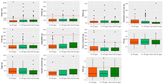 Young adults (18~30 years old) consumed more eggs, meat, soybeans and nuts, dairy products, oil and salt than adults aged 31 to 50 and those aged >51 years old (Figure 5). The intakes of water by young adults (18~30 years old) and adults aged 31 to 50 were significantly lower than those aged >50 years old (p < 0.05); there was no significant difference between the two younger groups. The intakes of eggs and dairy products by young adults (18~30 years old) and adults aged 31 to 50 were significantly higher than those by the aged >50 years old (p < 0.05). Moreover, there was no significant difference between the two younger groups. The intakes of salt by young adults (18~30 years old) were significantly higher than the intakes of adults aged 31 to 50 and those aged >50 years old (p < 0.05); there was no significant difference between the two older groups.