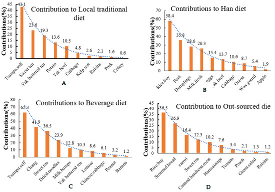 According to the preset criteria of variable selection (i.e., eigenvalue > 1 and the accumulation of total variance is 86.9%), there are four principal components; dietary patterns were retained by PCA method. Dietary patterns were named in accordance with the interpretability and characteristics of the items retained in each pattern and the items with the highest factor loadings were the ones that most influenced the interpretation and denomination of factors [17]. Food items with factor loadings ≥0.3 or ≤−0.3 was considered significant for this sample size (Supplementary Table S3) [2,8]. The contributions of food items (top 10 food items that contribute the most) for each dietary pattern are shown in Figure 6. The dietary pattern identified by principal component 1, which is labeled the Local traditional diet (the eigenvalue is 3.24, the variance contribution is 37.3% and the cumulative variance contribution is 37.3%), was characterized by a high intake of tsampa, culturally specific beverages (sweet tea and yak buttered tea), potato and yak beef. The dietary pattern identified by principal component 2, which is labeled Han diet (the eigenvalue is 1.9, the variance contribution is 21.9% and the cumulative variance contribution is 59.2%), is comprised of rice, pork, dumplings, eggs, milk and cabbage. The dietary pattern identified by principal component 3, which is labeled Beverage diet (the eigenvalue is 1.21, the variance contribution is 13.9% and the cumulative variance contribution is 74.3%), mainly includes tsampa, chang (homemade barley wine) and sweet tea. Dietary pattern identified by principal component 4, which is labeled Out-sourced diet (the eigenvalue is 1.09, the variance contribution is 12.6% and the cumulative variance contribution is 86.9%), mainly includes rice, steam bread and some processed meat, such as canned luncheon meat and ham-sausage.