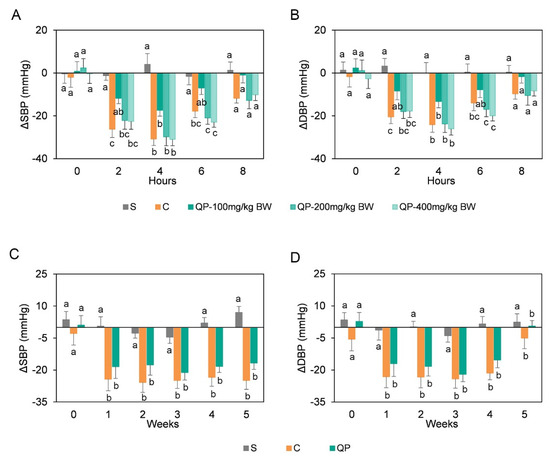 Oral administration of quinoa protein has an impact on the blood pressure of spontaneously hypertensive rats (SHRs). In the short-term study, systolic blood pressure (SBP) (A) and diastolic blood pressure (DBP) (B) in SHRs were measured at 0, 2, 4, 6, and 8 h after oral administration of saline solution (S), captopril (C), 100 mg/kg BW, 200 mg/kg BW, and 400 mg/kg BW quinoa protein (QP). In the long-term study, SBP (C) and DBP (D) of SHRs were measured during five-week administration of saline solution (S), captopril (C), and 200 mg/kg BW quinoa protein (QP). Based on the initial blood pressure value before intervention, change values of blood pressure (ΔSBP and ΔDBP) were expressed as the mean ± standard error of the mean. At each time point, columns with different letters are significantly different at p < 0.05.
