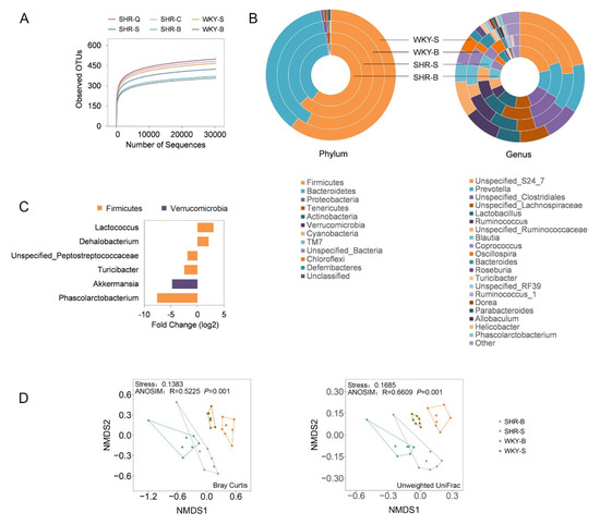 Significant differences in fecal microbial compositions between spontaneously hypertensive rats (SHRs) and Wistar Kyoto rats (WKYs). SHR–B and WKY–B: rats at baseline (10-week-old); SHR–S and WKY–S: rats administrated by saline solution for five weeks (15-week-old); SHR–Q and SHR–C: rats orally administrated by quinoa protein and captopril for five weeks (15-week-old), respectively. (A) Rarefaction curves. (B) Relative abundance of fecal microbiotas at the phylum and genus levels in rats. Four layers of donuts from the center to the outside represent the relative abundance of fecal microbiotas in SHR–B, SHR–S, WKY–B, and WKY–S, respectively. (C) Differentially abundant genera by DESeq2 (Padj < 0.01) when SHR–S vs WKY–S. (D) β-diversity of the fecal microbiota based on nonmetric multidimensional scaling (NMDS) analysis.