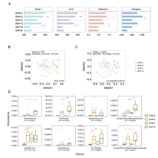 Significant differences in the fecal microbial structure of rats. SHR–S and WKY–S: rats administrated by saline solution for five weeks; SHR–Q and SHR–C: rats administrated by quinoa protein and captopril for five weeks, respectively. (A) Alpha diversity of fecal microbiota in different group rats. Significant differences are marked by * p < 0.05 and ** p < 0.01. Beta diversity of the fecal microbiota based on Bray–Curtis (B) and Unweighted UniFrac (C) distances by NMDS analysis. (D) Relative abundance of representative genera in fecal microbiota. P values denote the result of the Kruskal–Wallis comparison; markings above boxplots denote the Dunn’s post hoc result (with Bonferroni correction). Significant differences are marked by * Padj < 0.1; ** Padj < 0.05; *** Padj < 0.01.