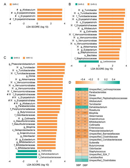 LEfSe analysis identifying taxonomic differences in fecal microbiotas. Histograms of LDA scores of microbiotas in (A) SHR–S vs SHR–C, (B) SHR–S vs SHR–Q, and (C) SHR–S vs WKY–S are shown with a cutoff value of LDA score above 2.0. Enriched taxa in SHR–S are indicated with a negative score (green), and taxa enriched in the SHR–C, SHR–Q, and WKY–S are characterized by a positive score (orange). The symbol “※” denotes the enriched taxon of both SHR–Q and WKY–S, and the symbol “#” denotes the enriched taxon of both SHR–C and WKY–S. (D) Heatmap of Spearman’s correlations between key microbiotas and blood pressure levels. Colors range from orange (negative correlation) to green (positive correlation). Significant correlations are marked by * p < 0.05, ** p < 0.01, *** p< 0.001.