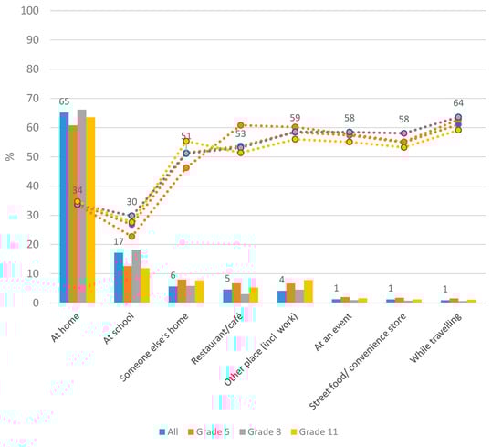 The majority, 65%, of all food and beverage consumption occurred at home (Figure 1). The next most common locations were school (17%) and someone else’s home (6%), and the pattern was similar in all age groups. The proportion of energy intake that came from discretionary foods/beverages was greatest while traveling, at other places (including at work), at street food/convenience stores and at events. However, these locations did not contribute much to overall intake. Conversely, although home and school were locations where the least energy from discretionary foods/beverages was consumed, they were still locations where most of the total intake occurred.