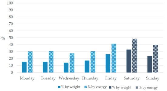 - Nordman, M.; Matthiessen, J.; Biltoft-Jensen, A.; Ritz, C.; Hjorth, M.F. Weekly variation in diet and physical activity among 4–75-year-old Danes. Public Health Nutr. 2020, 23, 1350–1361. [Google Scholar] [CrossRef] [PubMed] [Green Version]