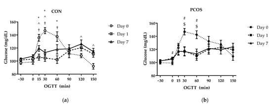 Mean (± SE) glucose concentrations in (a) CON (n = 15) and (b) PCOS (n = 14) across timepoints. * = significance between Day 0 and Day 1 for CON; ^ = significance between Day 0 and Day 7 for CON; † = significance between Day 1 and Day 7 for CON; # = significance between Day 0 and Day 1 for PCOS; $ = significance between Day 0 and Day 7 for PCOS, p < 0.05. CON = non-PCOS women; OGTT = oral glycemic tolerance test; PCOS = women with polycystic ovarian syndrome.