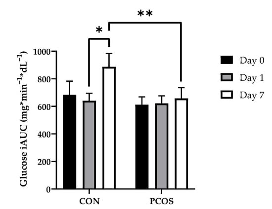 Glucose iAUC mean values (±SE) in CON (n = 15) and PCOS (n = 14). * = significance between days; ** = significance between groups for day, p < 0.05. CON = non-PCOS women; iAUC = incremental area under the curve; PCOS = women with polycystic ovarian syndrome.
