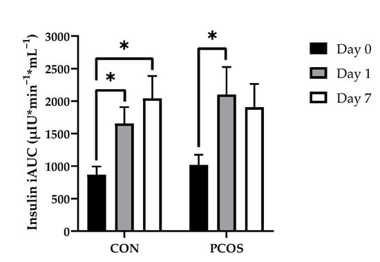 No interaction effect of day × group [F(2, 52) = 2.95, p = 0.06] nor main effects for both day [F(2, 52) = 1.27, p = 0.29] and group [F(1, 26) = 0.14, p = 0.71] were found to impact insulin iAUC values (Figure 5). Post hoc analyses revealed Day 0 insulin iAUC to be lower than Day 1 (p = 0.02) and Day 7 (p < 0.01) for the CON group, whereas Day 0 was lower than Day 1 only (p < 0.01) in the PCOS group.
