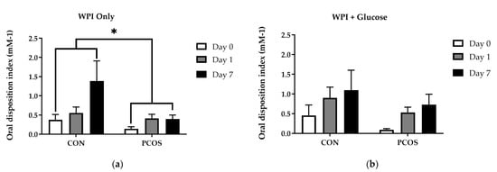 Figure 7 displays the Oral Disposition Index (DIO) values across all days for both groups. DIO after WPI ingestion alone (Figure 7a) showed no interaction effect of day × group [F(1.3, 32) = 3.299, p = 0.075]. Alternatively, the main effects of both group [F(1, 16) = 5.823, p = 0.028] and day [F(1.3, 32) = 6.273, p = 0.015] were found. Post hoc analyses revealed CON values were higher compared to PCOS values overall and Day 7 values were higher than Day 0 values overall (p = 0.033). After glucose was ingested (Figure 7b), DIO yielded no interaction effect of day × group [F(2, 30) = 0.000, p = 1.000], nor main effects of either group [F(1, 15) = 1.656, p = 0.218] or day [F(2, 30) = 2.125, p = 0.137]. Analysis of DIO for WPI alone vs. WPI + Glucose yielded an effect of group for Days 1 (p = 0.045) and 7 (p = 0.024) but not Day 0 (p = 0.147), with CON being higher than PCOS on both days.