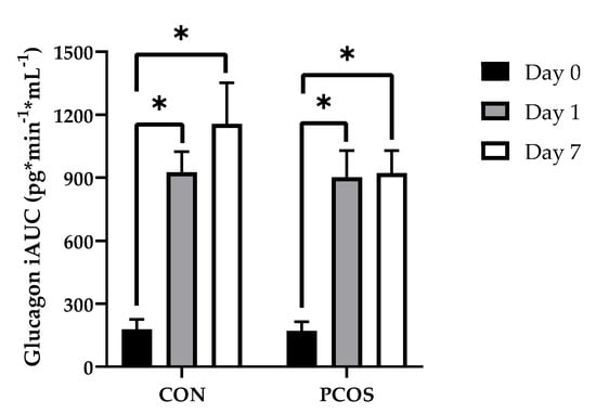 Glucagon iAUC mean values (± SE) in CON (n = 14) and PCOS (n = 15). * = significance between days, p < 0.05. CON = non-PCOS women; iAUC = incremental area under the curve; PCOS = women with polycystic ovarian syndrome.