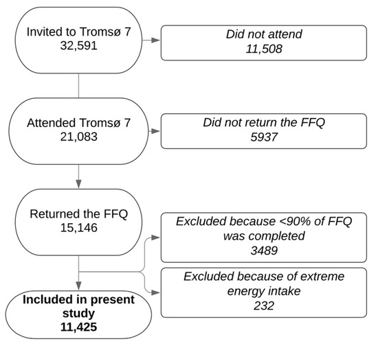 A total of 15,146 women and men completed the FFQ (72% of all Tromsø 7 participants). Participants with low completion rate (<90%) of the FFQ (n = 3489), and participants with unrealistic energy intakes (the 1% highest and lowest energy intake (above 21,267 or below 3948 kJ/da y, n = 232) were excluded (Figure 1), in accordance with Lundblad et al. [14]. Thus, the final sample in the present study included 11,425 persons aged 40–96 years (54% of all Tromsø 7 participants and 75% of those who completed the FFQ) (Table 1).