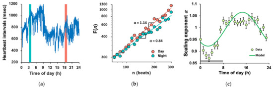 Heartbeat fluctuations exhibited fractal patterns as indicated by a power–law fluctuation function (Figure 2b). The mean α across 24 h was 0.983 ± 0.003 (SE), indicating strong temporal correlations in the fluctuations (note α = 0.5 for white noise).