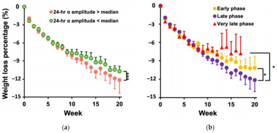 Association of weight loss evolution with the daily rhythm of FCD. Accumulative weight loss in each of the first 20 weeks over the dietary treatment in (a) individuals with small (<median) and large amplitudes (>median) and (b) individuals with early, late, and very late phases. The results and the p value were obtained from the Model 1b. Error bars indicate standard errors. * indicates p < 0.05, and *** indicates p < 0.0001 for the differences in WLS. Results were obtained after adjusting for daily energy intake and physical activity level.