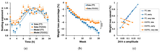 We further explored the potential effect of CLOCK 3111T/C on the association between the daily α rhythm and WLS. Model 3 revealed significant differences between C carriers and T carriers in the effects of both amplitude and phase of daily 24 h α rhythm on the WLS (p < 0.0001 for the CLOCK * amplitude * week, and p = 0.036 for the CLOCK * phase * week) (Figure 4c). Specifically, the WLS within C carriers was significantly larger in the late phase group (0.46 ± 0.03% [SE] of initial body weight per week) than that of the early (0.36 ± 0.03%, p = 0.03) or very late phase (0.21 ± 0.07% of initial body weight per week) (p = 0.004), while TT carriers showed no significant differences in WLS between different phase groups (early phase group: 0.56 ± 0.04%; late phase group: 0.54 ± 0.02%; very late phase group: 0.48 ± 0.03%; all p > 0.1 Supplementary Table S1 [48]). In contrast to the phase effect, the association between the 24 h α amplitude and WLS was stronger in TT carriers as compared that in C carries (p < 0.001; Figure 4c and Figure S2 [48]), i.e., an increase of 0.04 in the 24 h α amplitude (1 SD of all the individual values) was associated with an increase of 0.14% in WLS within TT carriers but was associated with −0.05% in WLS within C carriers. The genetic effects on the amplitude–WLS and phase–WLS associations were further confirmed by performing statistical models within C carriers and within TT carriers, separately, i.e., the amplitude–WLS association was significant within TT carriers (p < 0.0001) but was not significant within C carriers (p = 0.08); the phase–WLS association was only significant in the C carrier data (p = 0.008) but not in TT carriers (p = 0.20). After controlling the effect of the 24 h α rhythm and its interaction with the genotype, the C carriers still had significant lower WLS than the TT carriers (p < 0.0001).