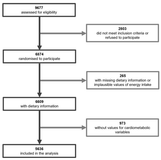 Study population: The PREDIMED-Plus trial (from the Spanish “PREvention with MEDiterranean DIet”) is an ongoing study launched in Spain in 2013 to assess the effect of an intensive lifestyle intervention—energy-restricted Mediterranean diet, increased physical activity and behavioral support—on the incidence of cardiovascular events and weight loss and its long-term maintenance. Details about the cohort have been described previously [50] and the study protocol, including study design and data collection, can be found at the PREDIMED-Plus website (https://www.predimedplus.com/en/, accessed on 20 May 2020). Briefly, the trial involves 6874 participants (48.5% female and 54.5% male) between 55–75 years old (mean age and SD 65.0 ± 4.9) who presented with overweight or obesity (27 ≤ BMI ≤ 40 kg/m2) and met at least three criteria for metabolic syndrome (MetS) as previously described [51]. The trial was designed as a 6-year, parallel-group, randomized clinical trial conducted in 23 Spanish study centers. The study protocol was approved according to the ethical standards of the Declaration of Helsinki by the Institutional Review Boards (IRBs) of all participating centers and all participants provided written consent of their participation in the study. This trial was retrospectively registered at the International Standard Randomized Controlled Trial Registry with number 89898870 on 24th July 2014. In the present analysis, baseline data from the PREDIMED-Plus study data set dated 26th June 2020 was used. These data correspond to data at the beginning of the study, before the dietary intervention took place. Participants with missing values for cardiometabolic variables were not included in the analysis. In addition, participants with implausible intakes (<500 or >3500 kcal for females and <800 or >4000 kcal for males) were excluded. The final number of participants included in the analysis was 5636 (48.5% female and 51.5% male, mean age and SD: 65.1 ± 4.9) (Figure 1). This study adhered to the STROBE cross-sectional reporting guidelines [52].