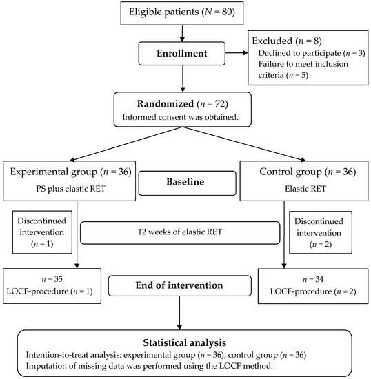 This prospective randomized controlled trial had two parallel study arms. The study protocol was executed at the rehabilitation center of a university-based hospital. This study was registered in the Chinese Clinical Trial Registry (registry number ChiCTR-IPR-17012106) and received ethical approval from the Joint Institutional Review Board of Taipei Medical University (trial number N201804049). Participants were enrolled from August 2018 to March 2020. All the participants provided consent at baseline admission 2 weeks prior to the intervention. At baseline, each patient was randomized into one of two groups: an experimental group (EG) receiving elastic PS + RET and an age-matched control group (CG) receiving RET alone. After enrollment, data on the participants′ demographic characteristics and comorbidities were extracted from a standard medical chart review, and a comorbidity score for each patient was calculated using the cumulative illness rating scale [53]. A 12-week intervention was employed for all participants in the CG and EG, which was followed by a follow-up period of 6 months. During the postintervention follow-up period, all participants were instructed to maintain individual dietary habits and regular physical activities, and a research assistant confirmed that all participants followed the instructions through monthly phone contact. The outcome data were collected by two trained research assistants who were blinded to the group assignment at baseline (i.e., pretest before intervention) and posttest after 12 weeks of intervention.