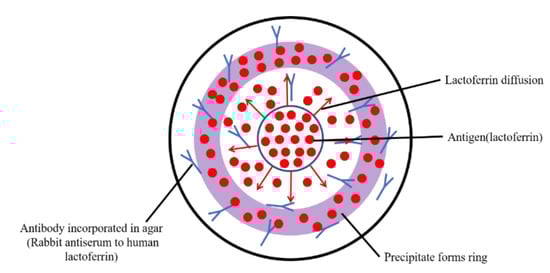 Scheme of radial immunodiffusion. Lactoferrin from the center would conjugate with its antibody and diffuse along the agar, and the area of the ring reflects its concentration.