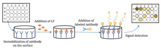 Enzyme-linked immunosorbent assay (ELISA) is a successful, rapid and accurate immunological analysis technique based on the specific reactions of antigens and antibodies, and has been widely applied on the quantification of proteins with high selectivity and accuracy (Figure 2). Many articles reported the application of ELISA on LF detection. It was reported that a sandwich ELISA method by applying rabbit anti-LF to the assay was able to measure LF in cows’ milk, cheeses and their whey with a detection limitation of 18 ng/mL [94]. Liu’s group also tried to detect the concentration of LF in milk powder by using sandwich ELISA assay. They prepared monoclonal antibodies based on hybridoma techniques and then labeled them with horseradish peroxidase for utilizing as a detection antibody. This kind of assay obtained the limit of detection (LOD) of 3.23 ng/mL with a linear detection range of 5–600 ng/mL [95].