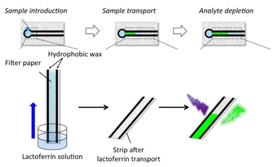 A novel microfluidic paper-based analytical device (μPAD) to measure the concentration of LF was reported by Kudo with a limit of detection of 110 μg/mL [113]. Such devices tend to have three main processes during the detection (Figure 4; namely the introduction of samples, followed by sample transportation and detection). This method utilized the high affinity between LF and ferric ions, and the color change which was caused by the replacement of the indicator from the complex of a colorimetric 2-(5-bromo-2-pyridylazo)-5-diethylaminophenol (5-Br-PADAP)-Fe3+ by LF, was considered as a signal for detection. The distance of the color changed area from the origin reflected the concentration of LF in the solution. Only a color readout app is needed to distinguish the boundary of different colors on the paper, and such paper-based device with good accuracy are easy to apply without any other instrument. However, the sample volume used for detection was 40 μL, which is relatively larger than other methods and not suitable for small sample analysis. Besides, the nonuniformity of papers’ cellulose substrate may affect the precision of colorimetric line and should be considered in this paper device. Further, Yamada’s research group developed another kind of distance-based μPAD for detecting LF by applying the fluorescence emission properties of the conjugation of LF and trivalent terbium as a signal. By analyzing the length of fluorescence on the μPAD channel, this method could reach a limit of detection of 0.1 mg/mL [114]. The dimension of the channel in the microfluid device was carefully modified and the sample volume was largely reduced to 2 μL. The paper was also treated on both sides by wax printer and anionic polysaccharides to eliminate the factor of heterogeneity of fiber.