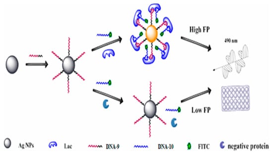 In addition to the μPAD, fluorescence-labeled bivalent aptamer-sensor was developed for the detection of LF [115] with the detection limit of 1.25 pM. Such a sensor took advantage of more than one amplification strategy to achieve sensitivity, selectivity and high amplification factor. Two different aptamers (DNA-9 and DNA-10) with high affinity for LF were screened by SELEX. DNA-10 was conjugated with fluorescein isothiocyanate (FITC), which was used for the generation of fluorescence after linking to the LF, and the DNA-9 was immobilized on the surface of silver nanoparticles (Ag NPs), which could enhance the intensity of the signal by the mass-augmented and metal-enhanced fluorescence (MEF) effect (Figure 5). This biosensor has good linear relationship between 0.2 ng/mL and 25 μg/mL, the range of which is relatively wide, and the determination limit (0.2 ng/mL) was much lower than that of the current methods, even than ELISA. The good recovery rates of standard addition were achieved between 97.5% and 103.3% by using samples (at the level of ng/mL) with 100-fold dilution, which represented the feasibility of this method for low concentrated and complex samples.