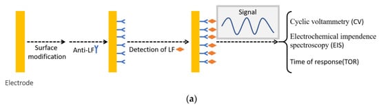 It has been widely posited that electrochemical biosensors work as a platform which could convert biological and chemical changes to electrical signal which could be detected by processor. Typically, such a system consists of a detection target (antibodies, DNA or RNA, and other biomolecules), transducer and signal processor. An electrical signal could be produced as the result of the selective interaction between the target and analyte. Then, it is transmitted via electrode to signal processor, which is responsible for the data amplification and separation. This makes this system acquire high selectivity, high accuracy and low detection limit. There are mainly two different types, namely affinity sensors with anti-LF on the surface of electrode (Figure 6a) and nonaffinity sensors by detecting potential changes in redox reaction regarding LF (Figure 6b).