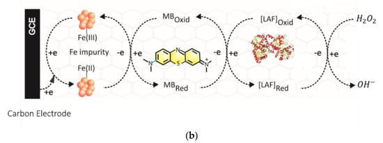 Electrochemical biosensor for the detection of lactoferrin (a) affinity sensor with anti-lactoferrin modified on the surface of electrode; (b) nonaffinity electrochemical sensor, detecting changes of potential in redox reaction between lactoferrin and hydrogen peroxide (reprinted with permission) [116].